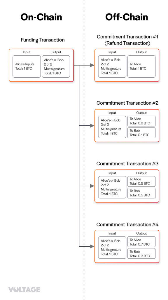 Este ejemplo es muy similar a cómo funciona un canal de pago en Lightning Network. Cuando dos personas abren un canal, bloquean una cierta cantidad de Bitcoin en la blockchain principal.